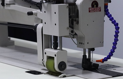 5. Model also features a back mounted puller feed system with bottom driven roller for extra feeding power and additional enhancements including: high torque electronic needle positing motor, air assisted reverse device, air operated auto foot lifter, air operated auto puller lifter, Knuckle quick reverse system and electronic stitch count box with inching control;