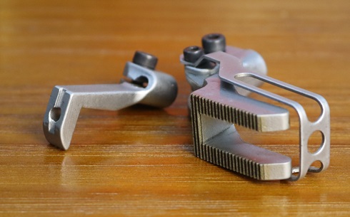 205F01: Long toe presser foot set with teeth: the extended toe increases contact area with the fabric, and the teeth on the bottom for a better feeding action, this presser foot is designed for sewing slippery material like webbing slings.