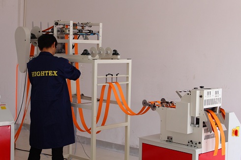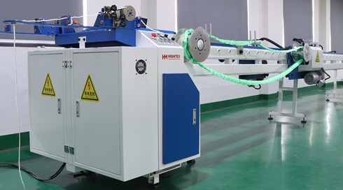 Станок для производства круглопрядные стропы HighTex RSM911 - это универсальное устройство для производства круглопрядных текстильных строп. Станок разработан для отмотки высокопрочного, как правило полиэстерового волокна, сбора его в пучок в виде кольца, с дальнейшим помещением его его в защитный чехол из тканого материла высокой прочности. Технологический контроль длины осуществляется измерителем, измеритель реализован на электронном счетчике.